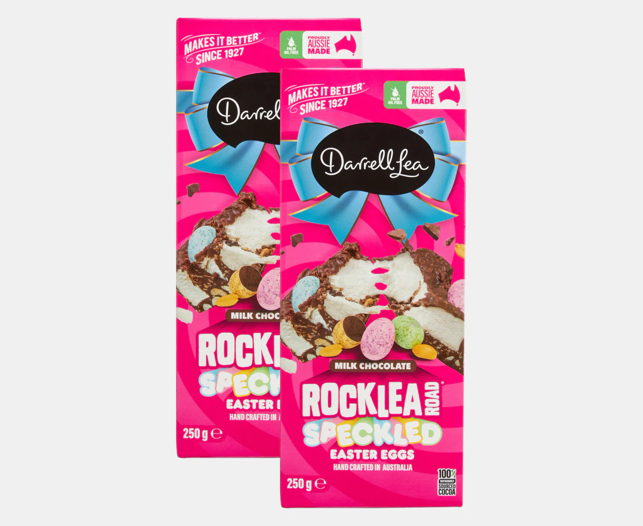 Darrell Lea's iconic Rocklea Road slab now comes with a delightful Easter twist - topped with delectable speckled Easter eggs. Still filled with fluffy marshmallows, crunchy peanuts and delicate coconut, it's also topped with the crispy goodness of speckled eggs.