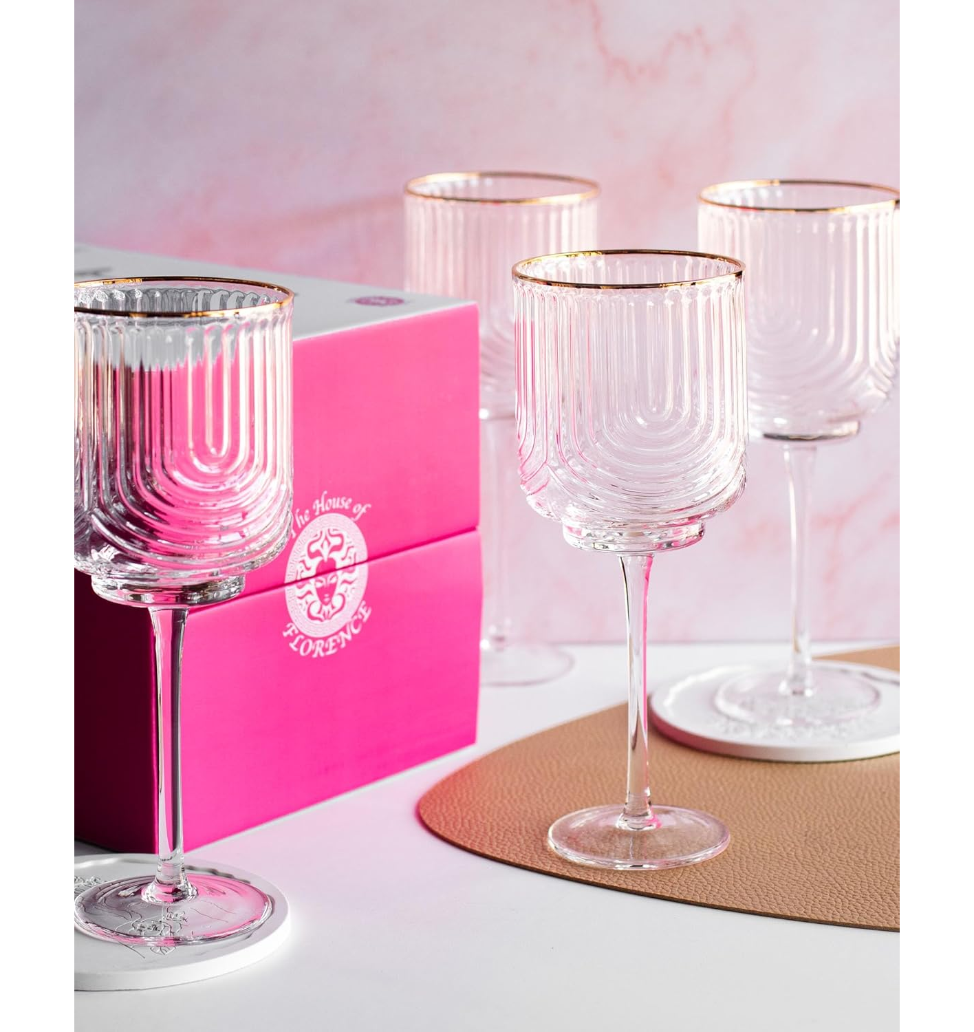 Crafted with meticulous attention to detail, these glasses boast a timeless footed base that not only enhances their aesthetic appeal but also ensures stability and balance. The luxurious gold rim adds a lavish touch, elevating your wine-drinking experience to new heights of sophistication.