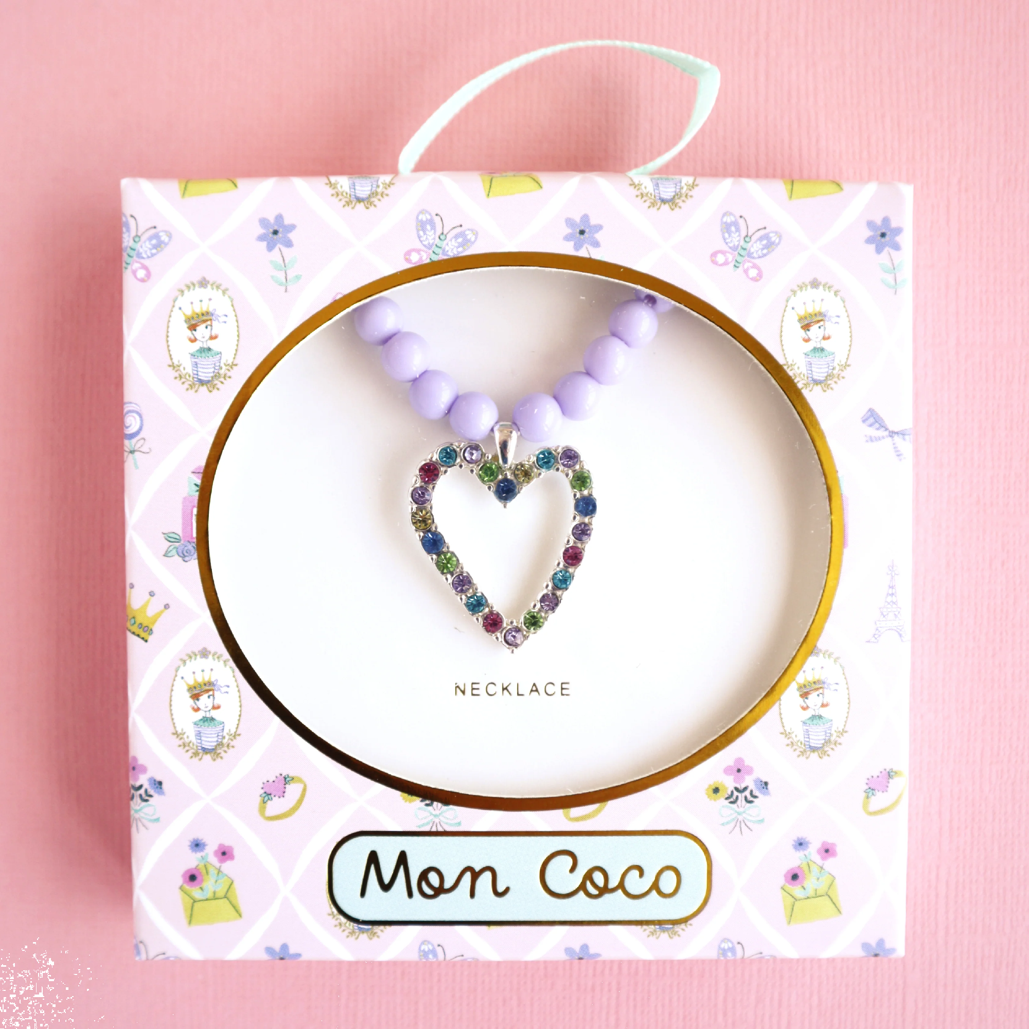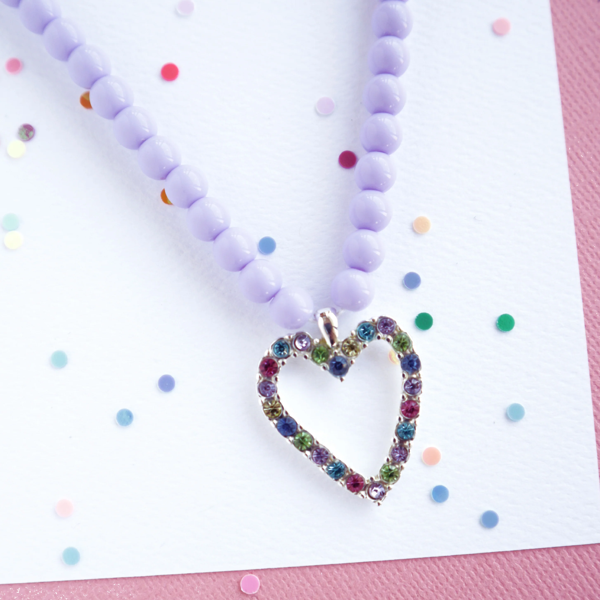 Carry a rainbow of gems on you all day with the twinkling, sparkling Jewel Heart Necklace. Set on a chain of lilac beads, the Jewel Heart is studded with diamante crystals in six colours and will be the highlight of any outfit or ensemble. A delight for lovers of colour and rainbows, the Jewel Heart Necklace is a treasure to be coveted.